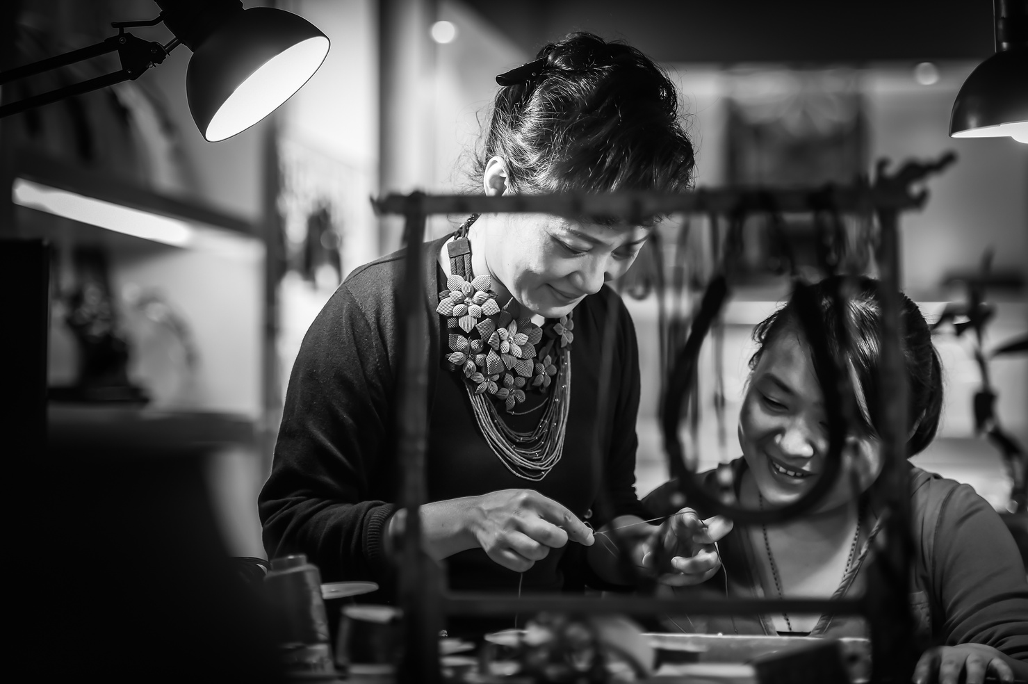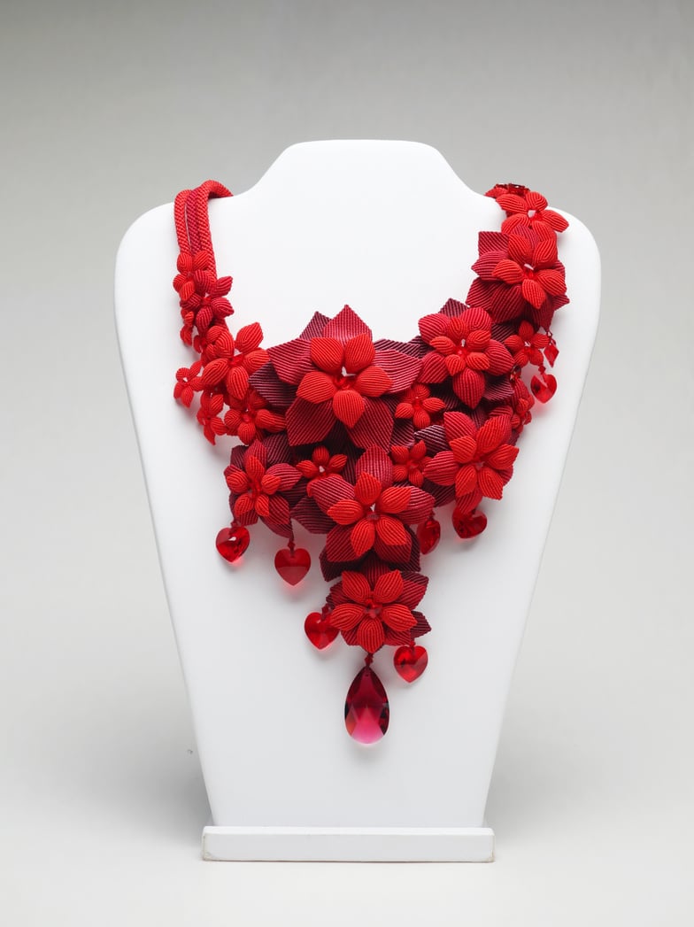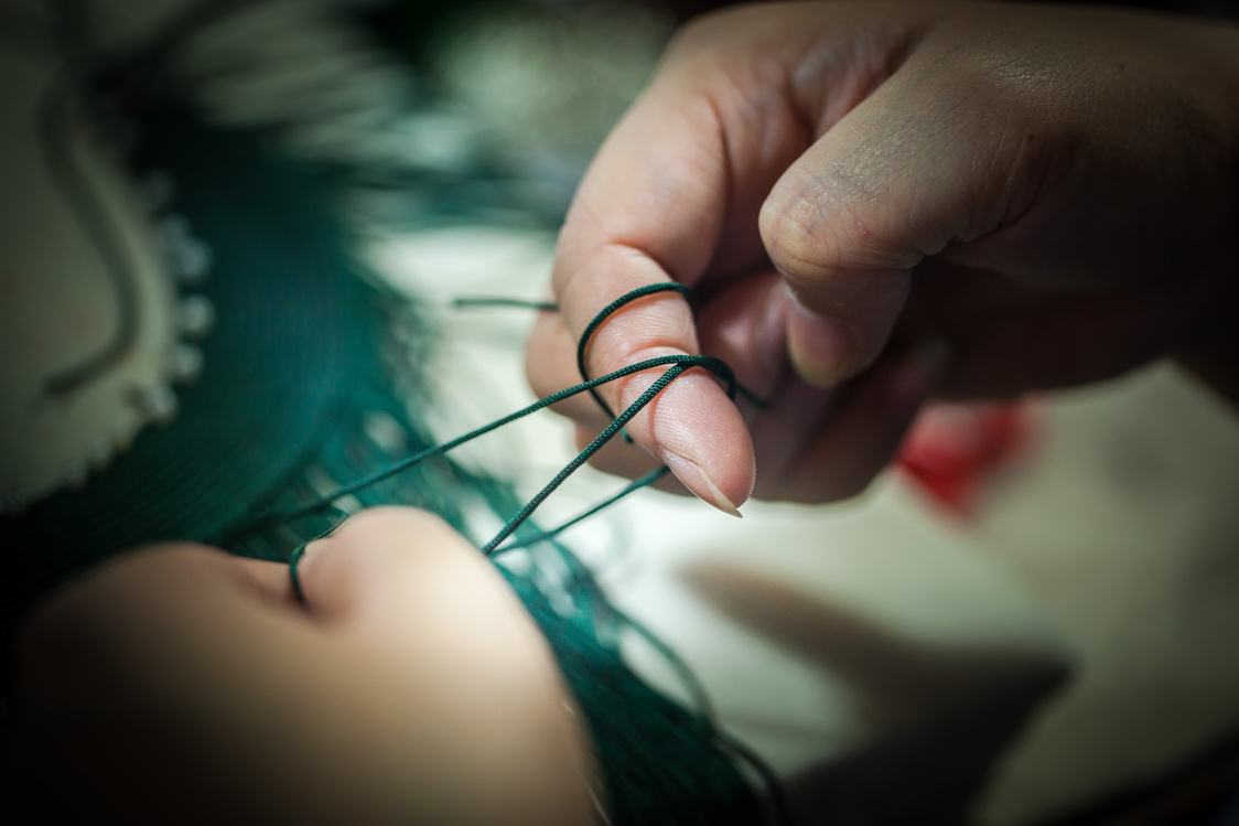 Ses œuvre est réalisée en utilisant toutes les techniques manuelles traditionnelles telles que le dessin, l'enroulement, la torsion, le tressage, l'enfilage, l'enroulement et le nouage.