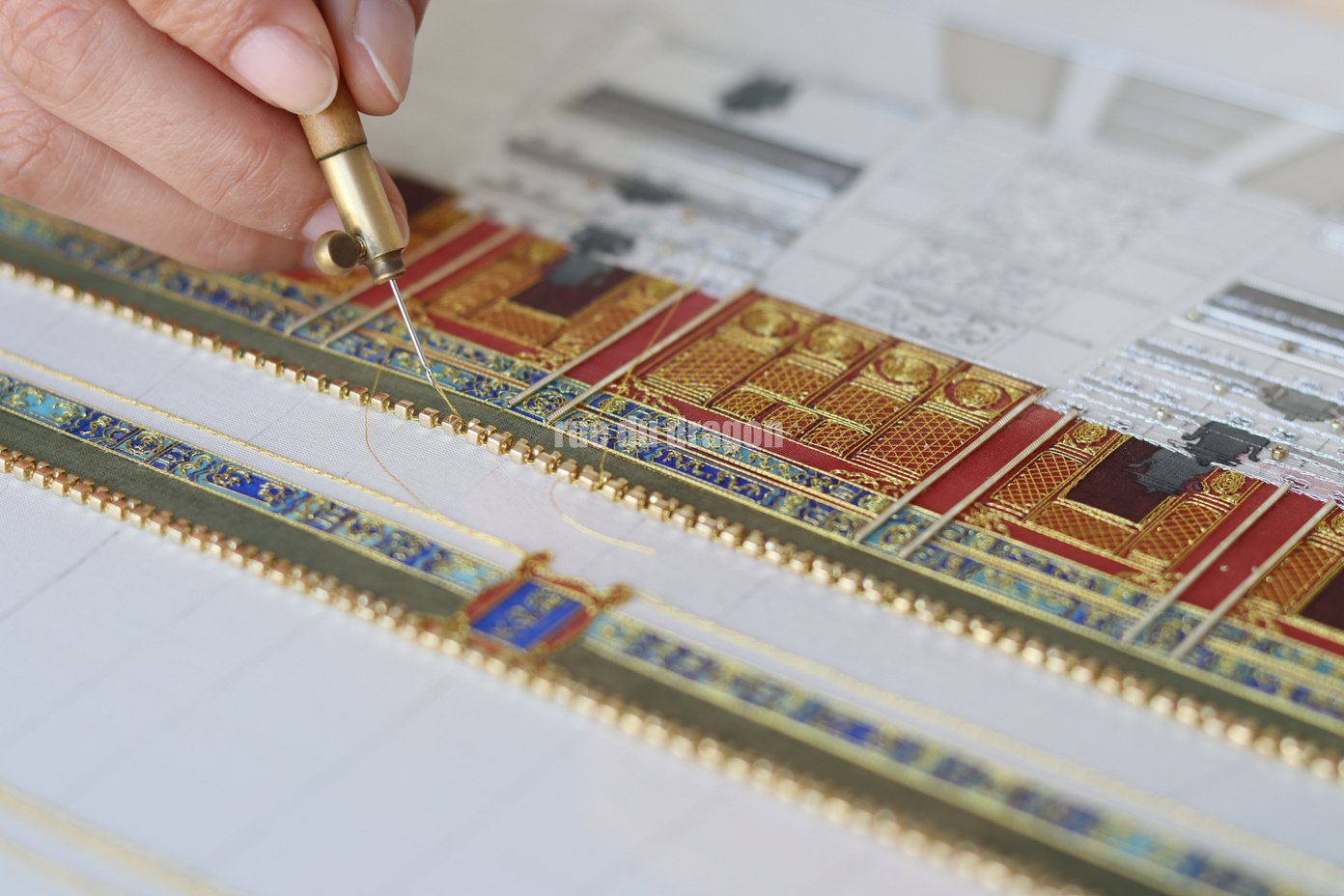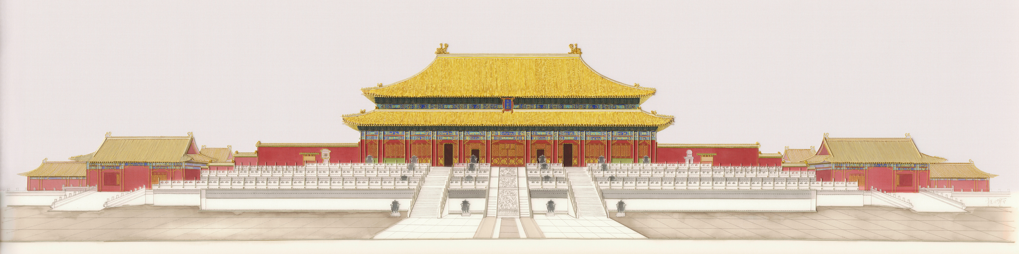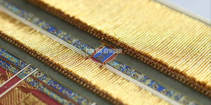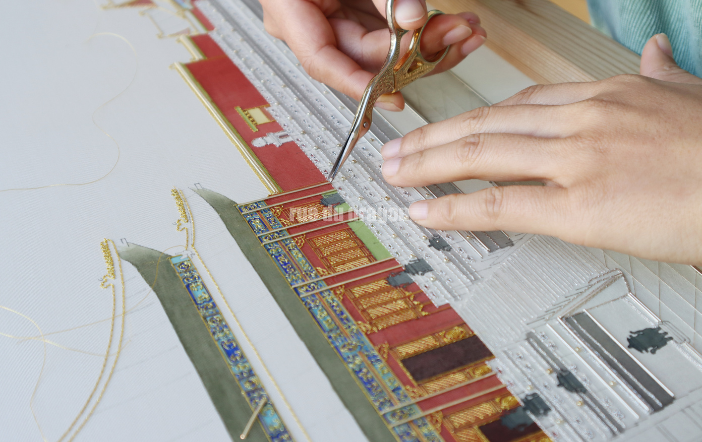 Cette œuvre est basée sur l'image réelle du Palais de l'Harmonie Suprême (Palais Taihe) dans la Cité Interdite à Beijing. Il s'agit d'un pur travail de broderie architecturale en soie.