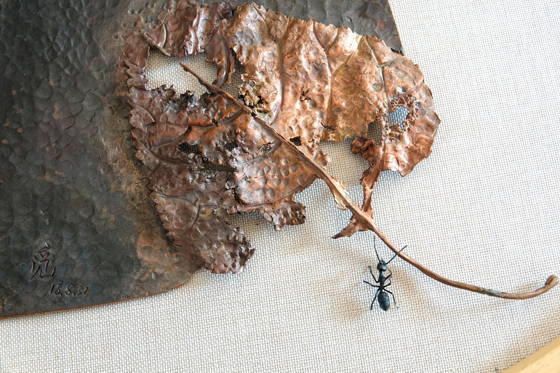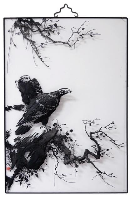 L'ensemble de la composition de l'œuvreest simple, avec deux aigles formant un contraste entre le réel et l'imaginaire, créant un mouvement dans la tranquillité. L'artiste utilise une technique exquise pour rendre les aiglesvivants et expressifs. Le tronc de l'arbreest vigoureux et puissant, et le traitement de la surface du fer fait ressortir le charme de l'encre de la peinturechinoise sur l'image. "Double Eagles " a remporté la médaille d'or au "Prix de la créativitéculturelle et de l'artisanat chinois" de la quatorzième Exposition Internationale de l’IndustrieCulturelle de Chine enmai 2018.